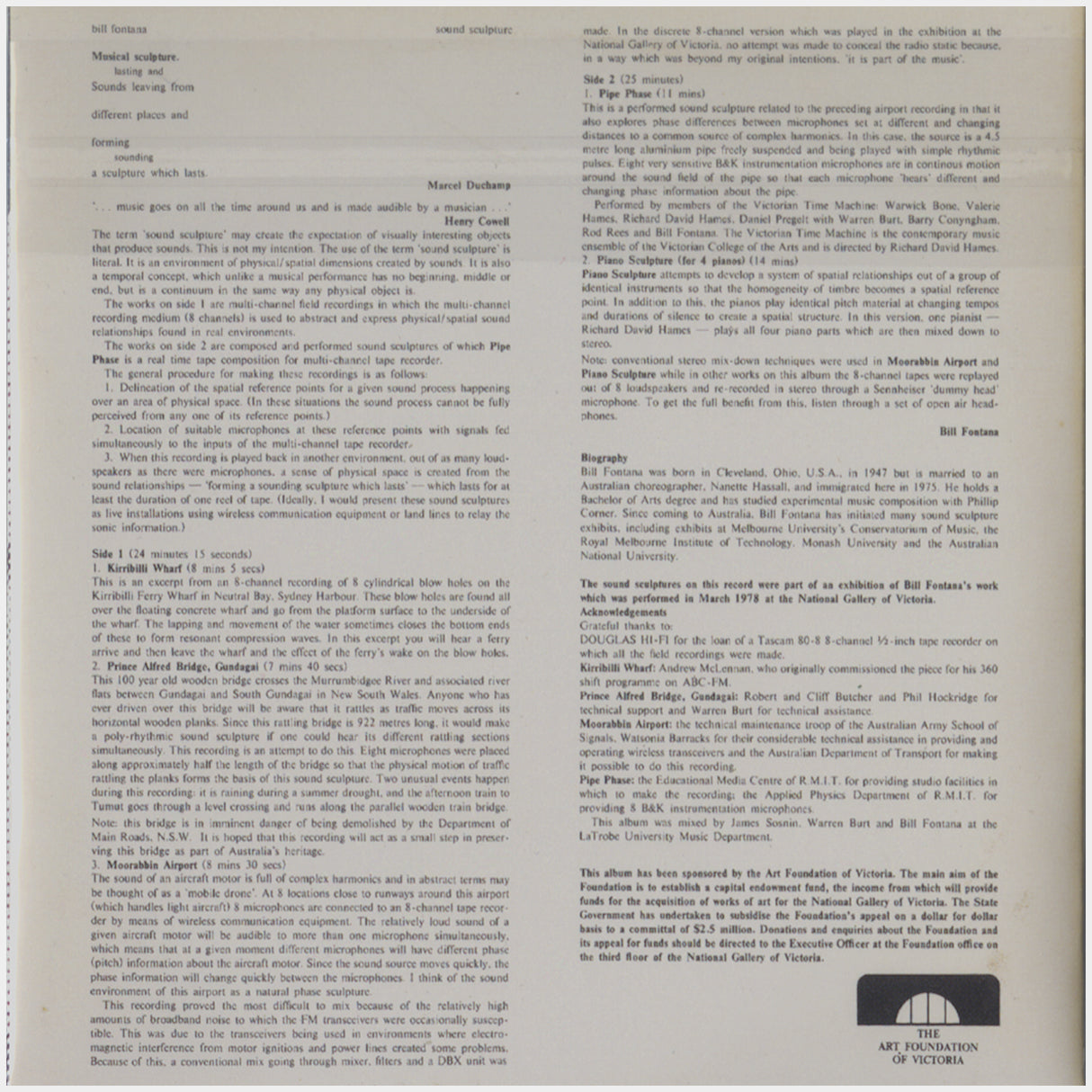 Bill Fontana; Sound Sculpture (EMI Custom #YPRX-1434, 1978)