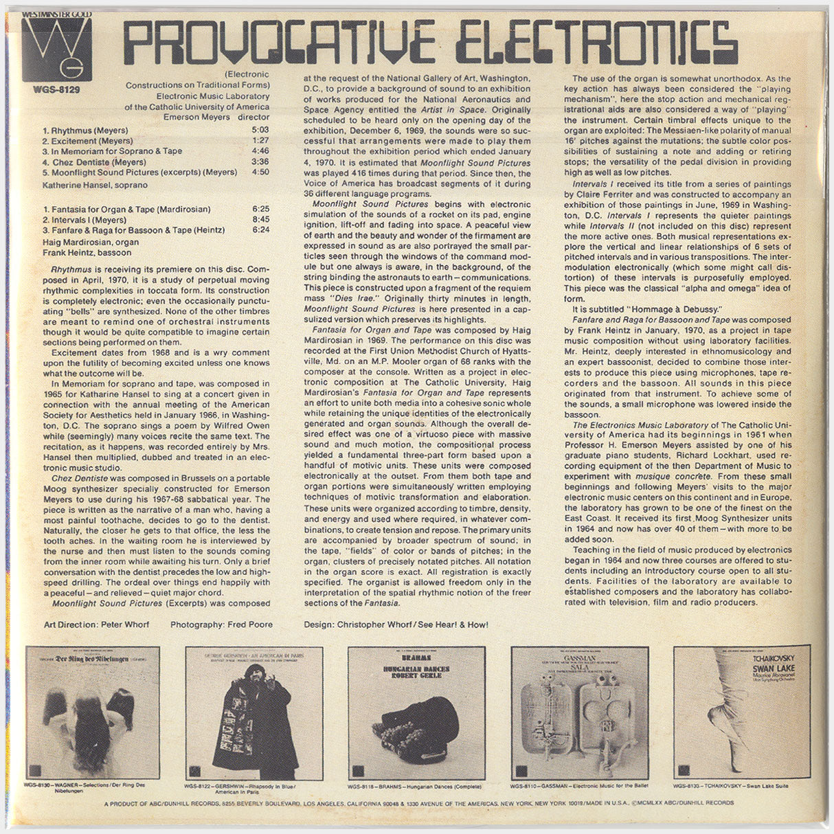 Creel Pone treatment of this 1970 hidden jewel in the Westminster Gold catalogue (an imprint enjoying something of a cult following amongst record collectors due to their amazing & often ridiculous cover designs; not sure how marketing Wagner / Opera recordings via Psychedelic-era cheesecake sensibilities was deemed “Viable” by the ABC-Dunhill bigwigs, but then again there are scads of things about the late-60s / early-70s that I don’t, and most likely won’t ever, get) featuring music largely composed by Professor Emerson Meyers, with scattered pieces by Haig Mardirosian & Frank Heintz, all composed & executed at the “Electronic(s) Music Laboratory” at (wait for it...) the Catholic University of America.